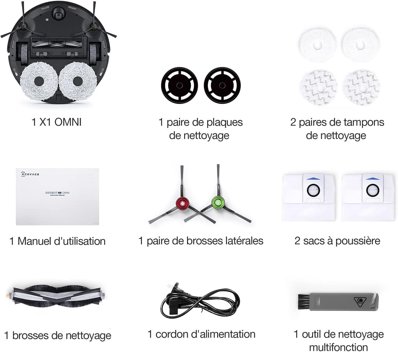 • LIEFERUMFANG: 1 DEEBOT X1 Saugroboter, 1 OMNI Multifunktions-Saug- und Wischstation, 2 Staubbeutel (1 vorinstalliert), 2 Seitenbürsten, 2 Reinigungsdüsen, 4 Reinigungstücher, 1 Ladekabel, 1 Reinigungsbürste, 1 Bedienungsanleitung, 1 Reinigungswerkzeug